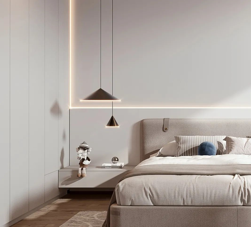 用悬浮柜做了一个柜格子,或延伸出来就解决了床头柜功能,里面还能多放一些物品。
