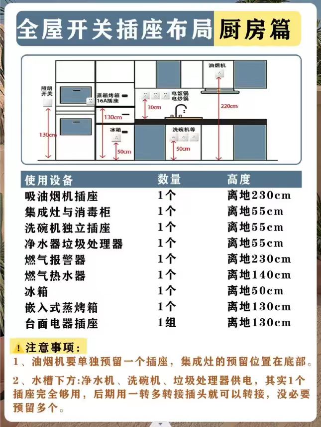 建议预留8-10个插座,2个五孔插座留给冰箱和油烟机;2个留给净水器、垃圾处理器,放在水槽下方;